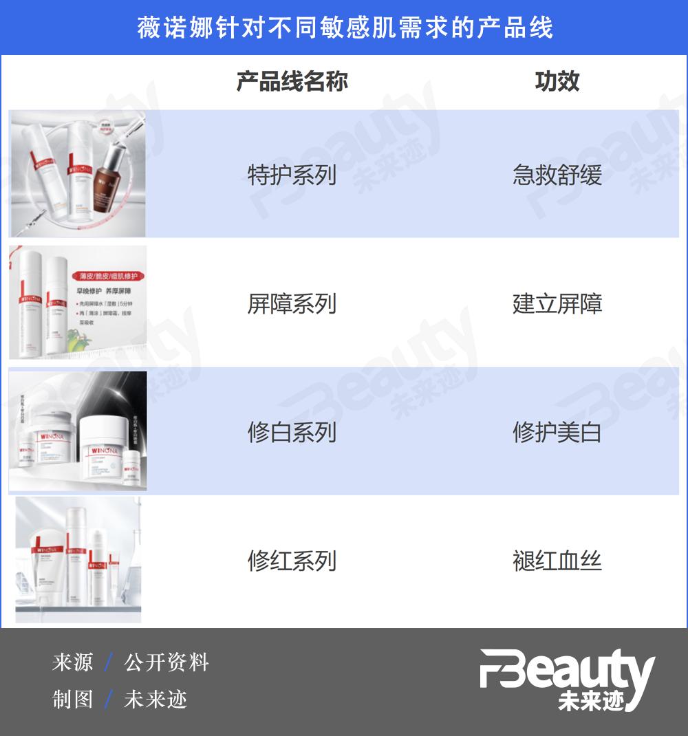 拿薇诺娜举例,目前其已经针对急救舒缓、屏障重建、美白、修红等细分需求分别推出差异化定位的产品管线,能够覆盖多种阶段的敏感肌问题。