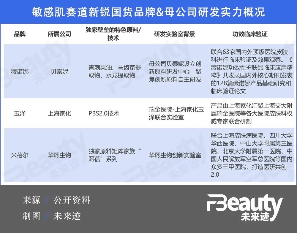 目前,在激烈的市场竞争中,敏感肌护理市场的几个新锐国货头部品牌或有着“医研共创”的专业背景,如薇诺娜、玉泽等;或依托母公司的强大研发体系与研发积累,如米蓓尔。这也是新锐国货之所以能够被消费者认可,甚至超越外资品牌并成为头部品牌的原因。