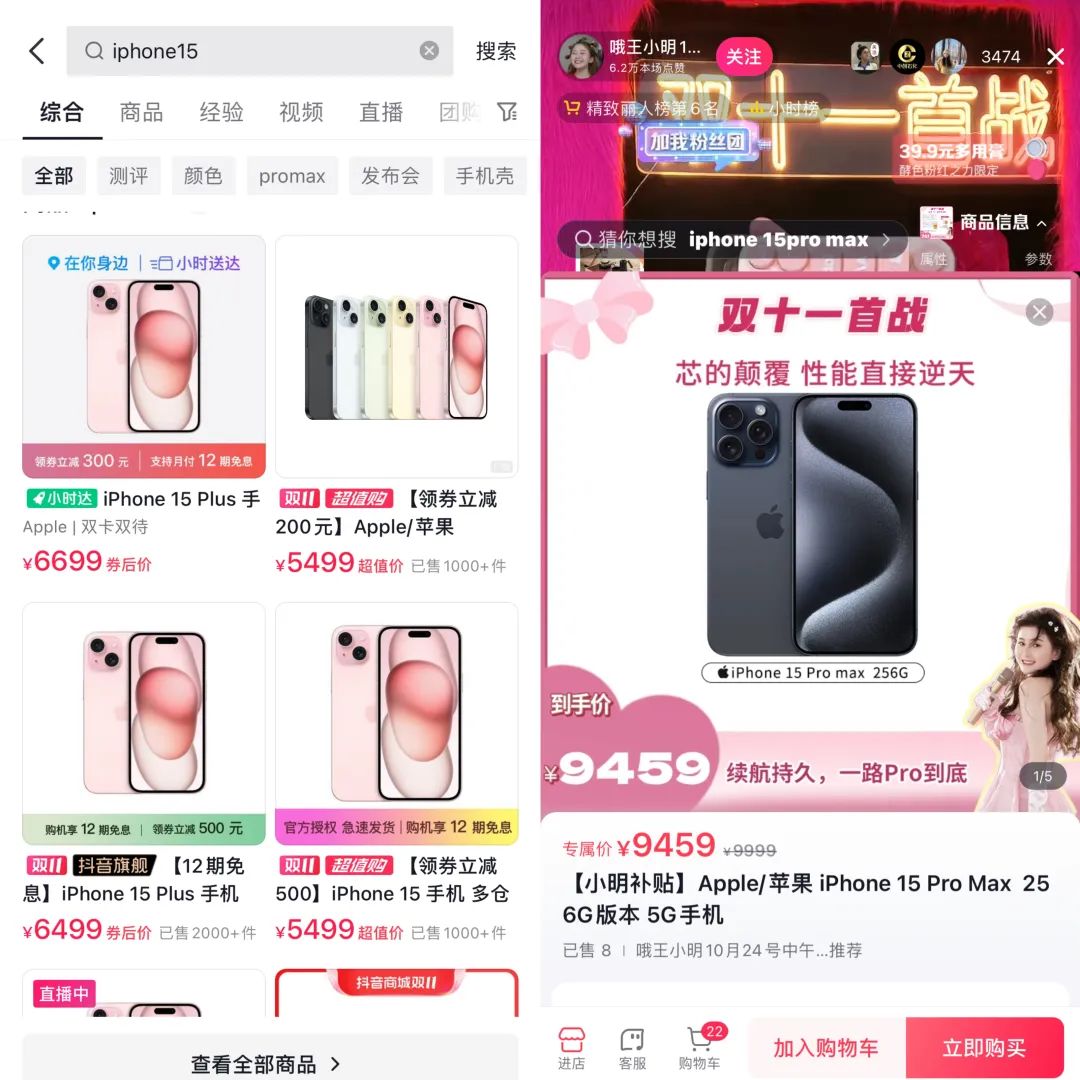 而在抖音电商平台,在双11促销页面下,显示iPhone15标准版领券直降500元,入手价5499元。在部分主播的直播间,iPhone15 Pro Max入手价也降至了9459元,比官网价便宜了540块。