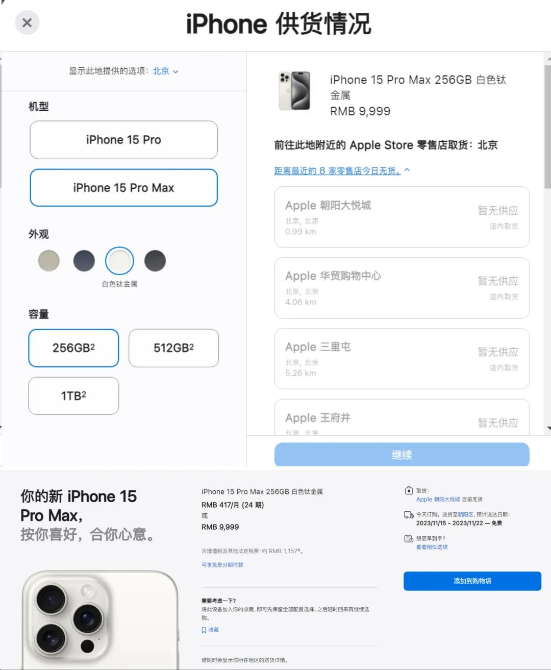 例如在苹果官网,iPhone15 Pro Max白色版本目前还显示为缺货。北京的各大零售店则均为无货状态,线上下单预计送达日期在2023年11月15日至2023年11月22日,发货周期在4周以上。