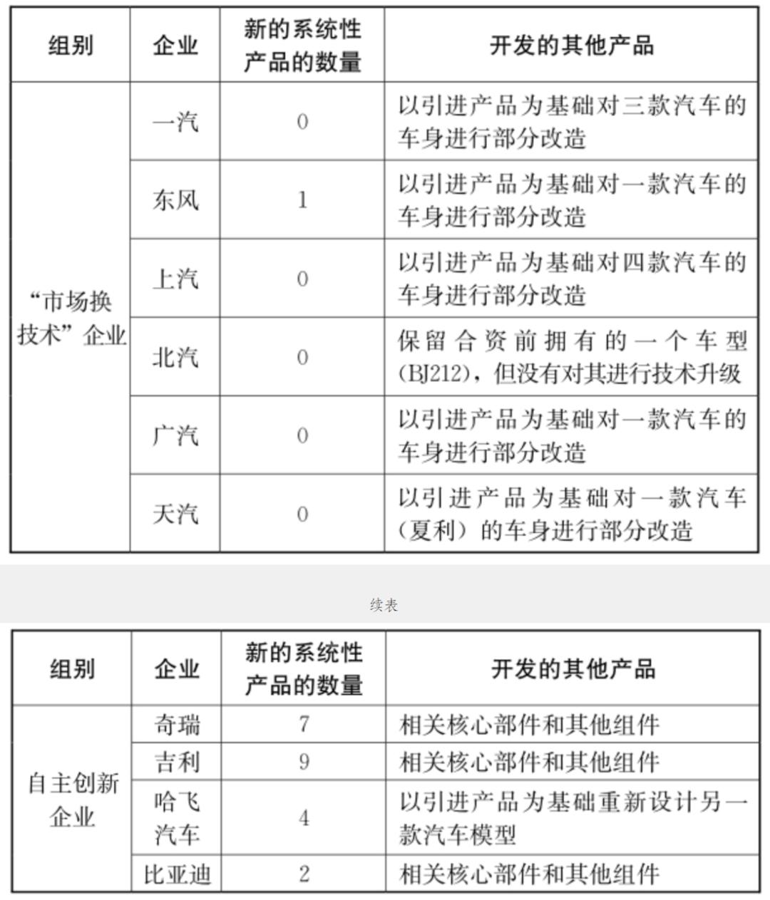 对于自主创新企业而言,由于必须依靠自主开发的产品才能够生存,它们自创建之初就持续开发新车型和发动机、变速箱等关键的复杂性技术部件。