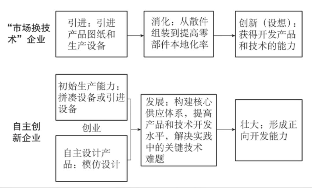 这两组企业的关键区别是对技术的学习战略。“市场换技术”企业的主要目标,是通过引进跨国公司作为合作伙伴,来进行技术学习。但事实上,跨国公司只想将本土公司,作为其全球生产网络中,负责生产制造和销售等环节,一是利用廉价劳动力,二是开拓中国市场。