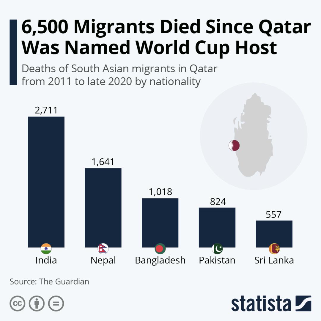 2011-2020年期间卡塔尔的外劳死亡人数,排第一的就是印度。
