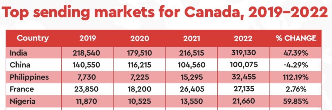 2022 年,有接近 32 万印度留学生进入加拿大,接近留学生人数的一半,比2021 年增加超47%,而人数排名第二的中国留学生,整个2022 年只有 10 万。