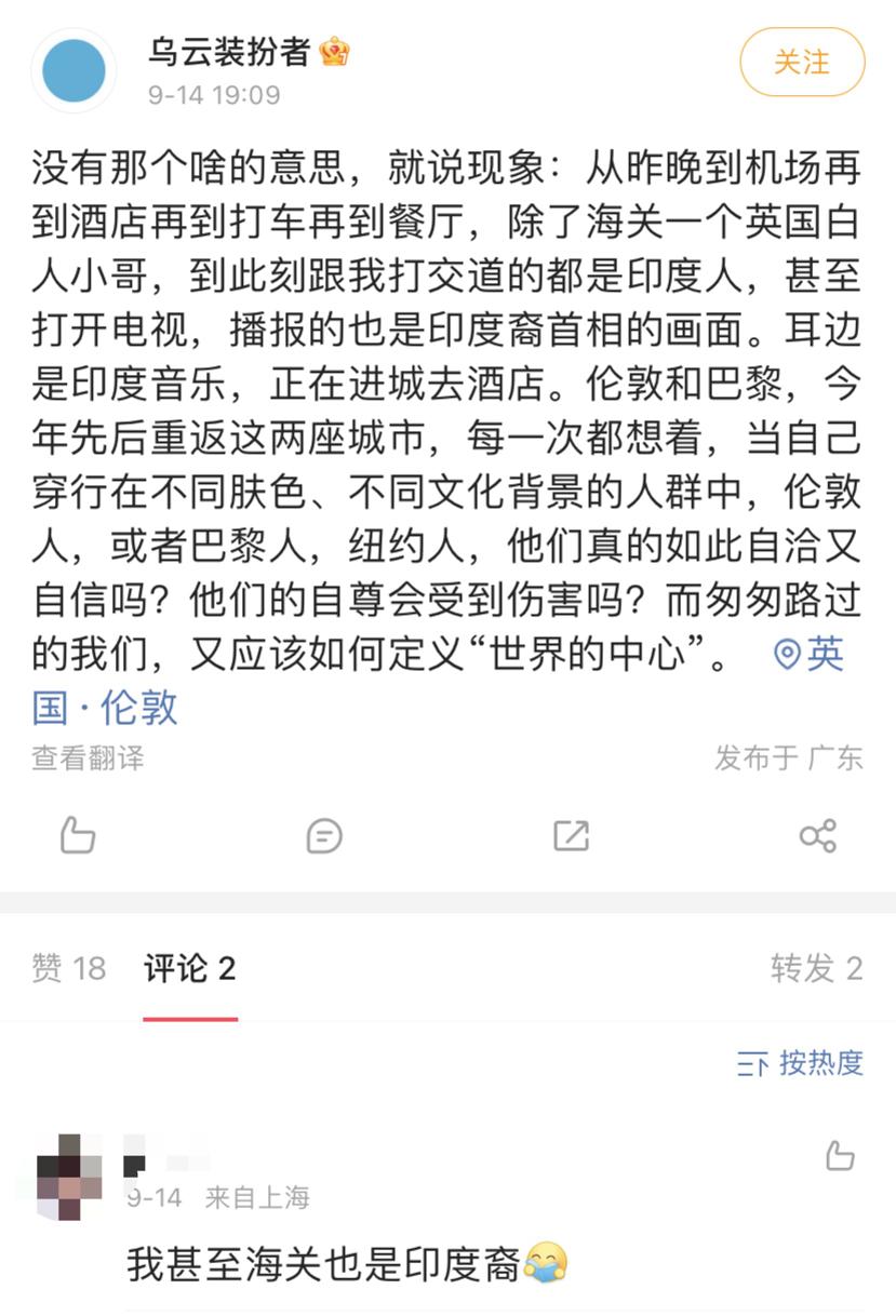 身处伦敦的网友发来前方战报:感觉印度游客剧增,而中国游客少了。从伦敦机场到酒店,都没有见到一个印度裔以外的面孔。