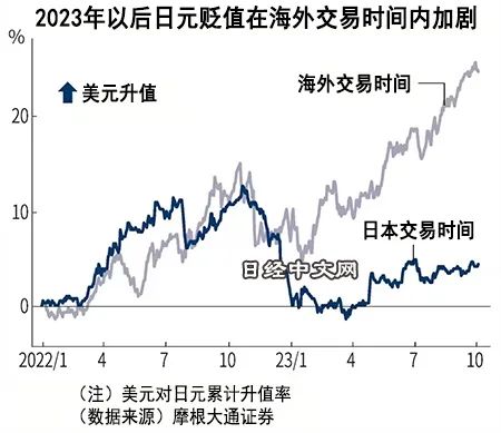 今年的日元贬值呈现出在日本时间的夜里加剧的强烈倾向。其原因是,在日美利率差扩大的影响因素下,很多海外投资者购买美元并卖出日元。