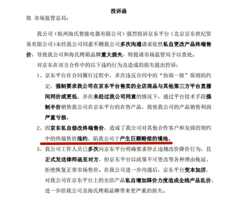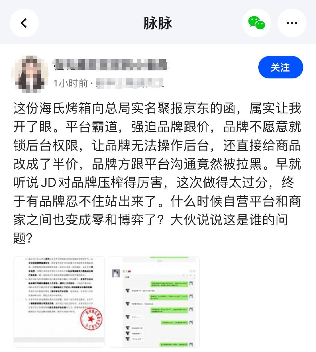 这位海氏(是卖烤箱的,不是卖口罩和碘棒的海氏海诺)工作人员,在有不同品牌方的群里,吐槽京东“压迫品牌方”,在品牌方不同意的情况下,调低价格,并且还让品牌方贴钱、给其他渠道赔钱。