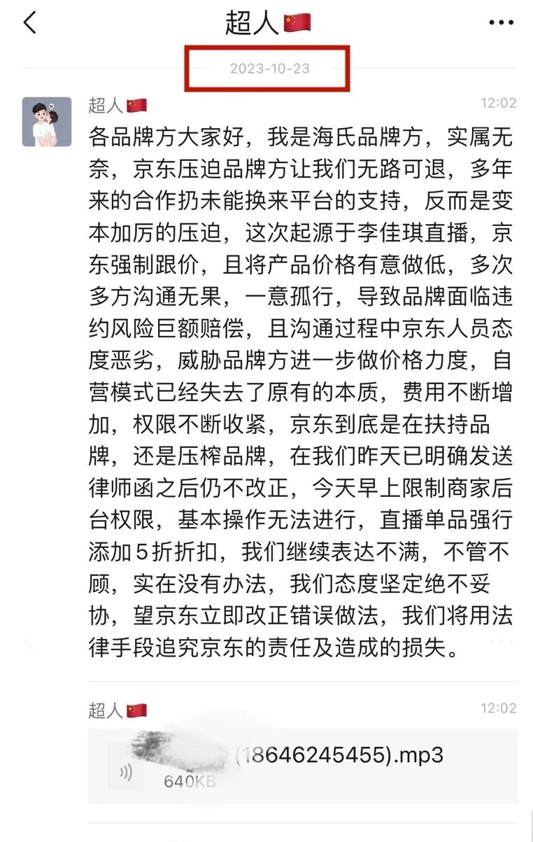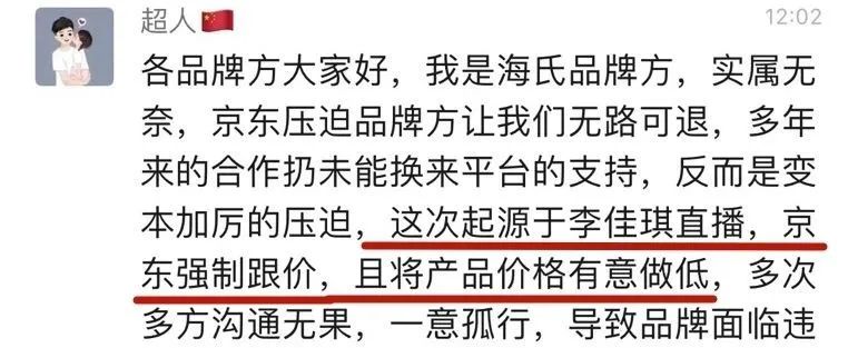 然后,海氏“超人”在群里来了一句“这次起源于李佳琦直播,京东强制跟价……”。