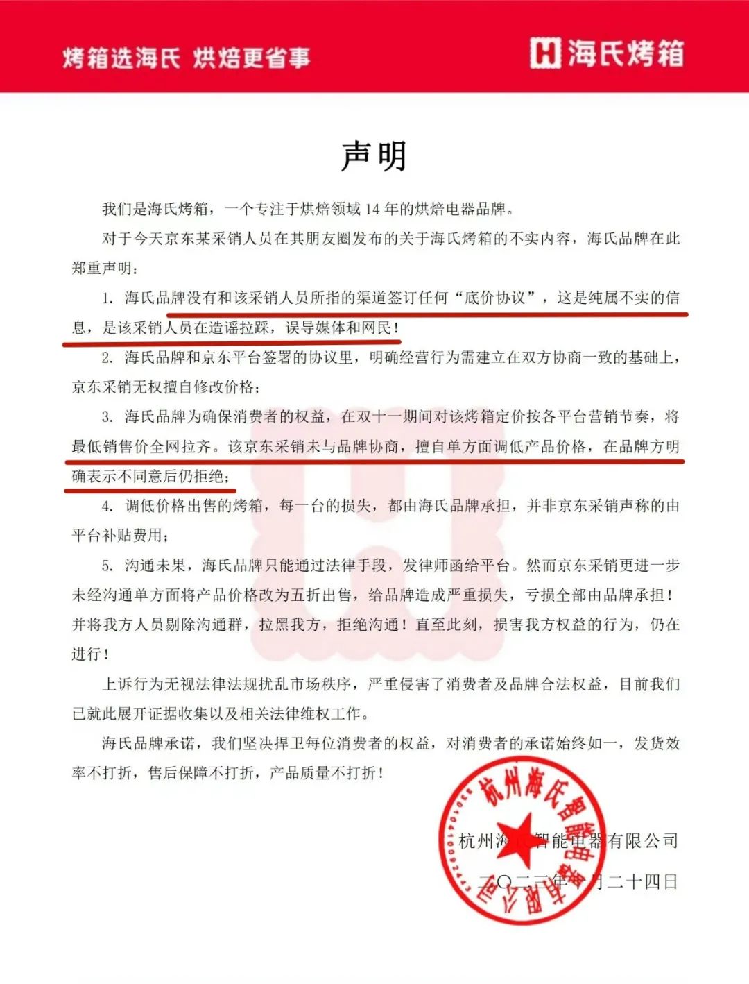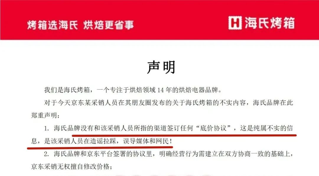 18点16分,海氏发布官方声明,列出京东众多“压迫”行为,强调降价的钱都会算在海氏头上,并称海氏品牌没有和该采销人员所指的渠道签订任何“底价协议”。