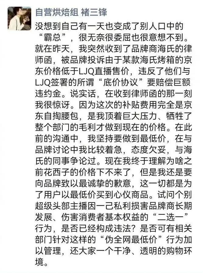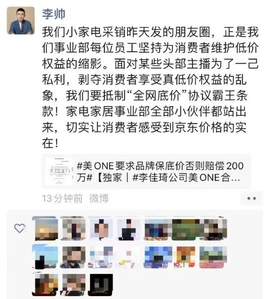 今天早上,京东家电家居相关负责人在朋友圈发文,支持昨天喊话李佳琦“二选 ”的采销同学,表示“面对某些头部主播为了一己私利,剥夺消费者享受真低价权益的乱象,我们要抵制‘全网底价’协议露王条款!”