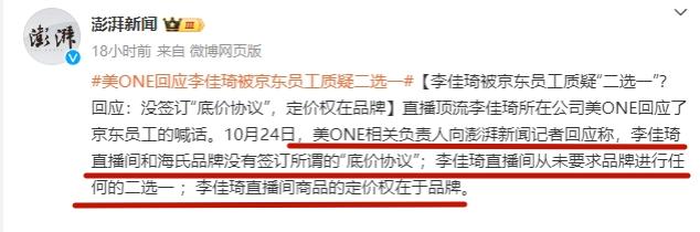 10月24日这个节点,美ONE肯定想能多苟着,就多苟着。再次带货花西子,讲道理应该预判到热度小不了;而被海氏的律师函和员工朋友圈关联,又被京东点出来,纯属倒霉。