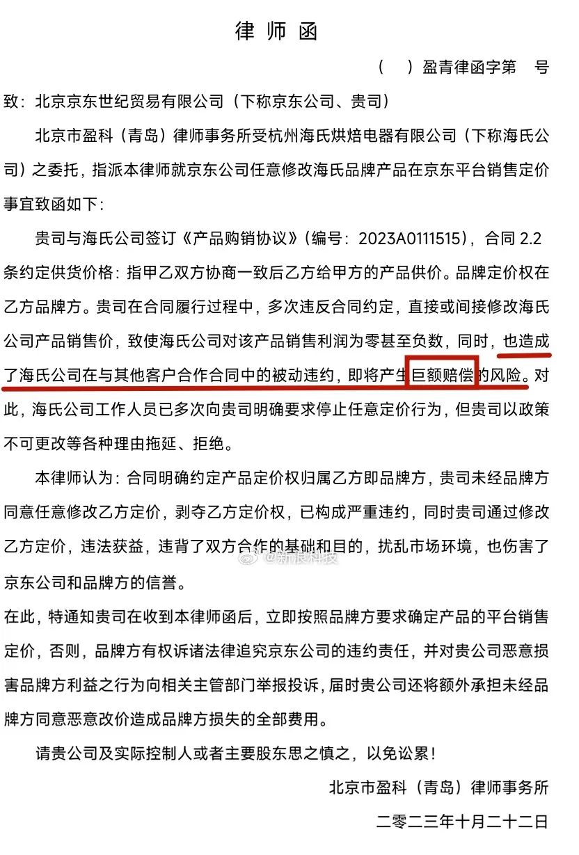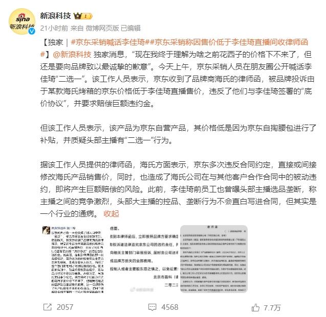 12点46分,新浪科技率先独家发布相关信息,打了#京东采销喊话李佳琦#的标签,并且晒出海氏给京东的律师函。事件正式从群范围、朋友圈范围,扩展到公域。