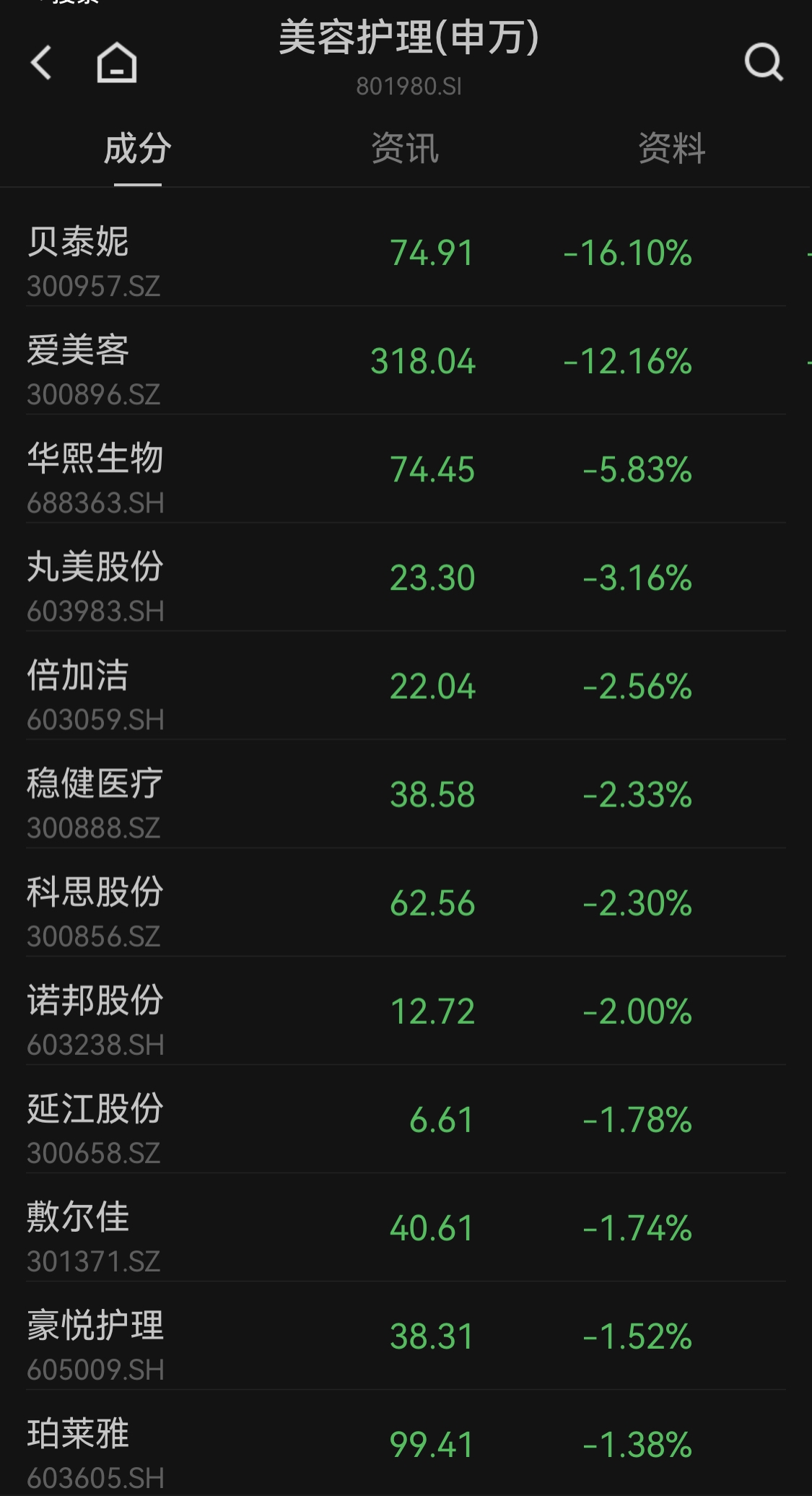 医美概念盘中跳水,贝泰妮跌超16%,爱美客跌超12%,华熙生物、昊海生科、锦波生物、朗姿股份等纷纷走低。CRO、医疗器械板块同步走低,泰格医药、戴维医疗、九强生物、开立医疗等跌幅居前。