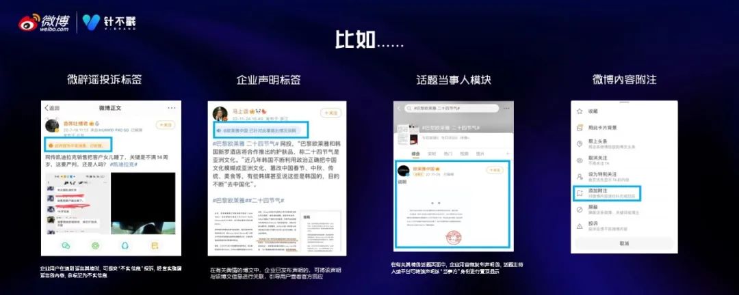 从短期来看,企业则要加强对网络话语生态的诊断,平时要做好预案和应对流程,突发时刻做好判断,合理利用平台的各种工具比如微辟谣投诉标签、企业声明标签、话题当事人模块、内容附注等。另外,我特别觉得企业一定要懂广告法,避免营销翻车,还要多了解各种法律法规,维护合法权益。