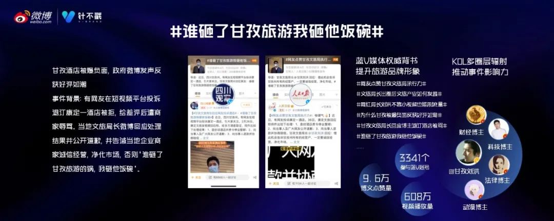 而且众多KOL和蓝V媒体参与转发评论此事,帮助甘孜创造了更多的热搜,比如#网友点赞甘孜文旅局执行力#、#为什么甘孜被爆负面反获好评如潮#、#甘孜文旅局长回应博主退订酒店被骂#、#文旅局长出圈后文旅产业如何发展#等等。