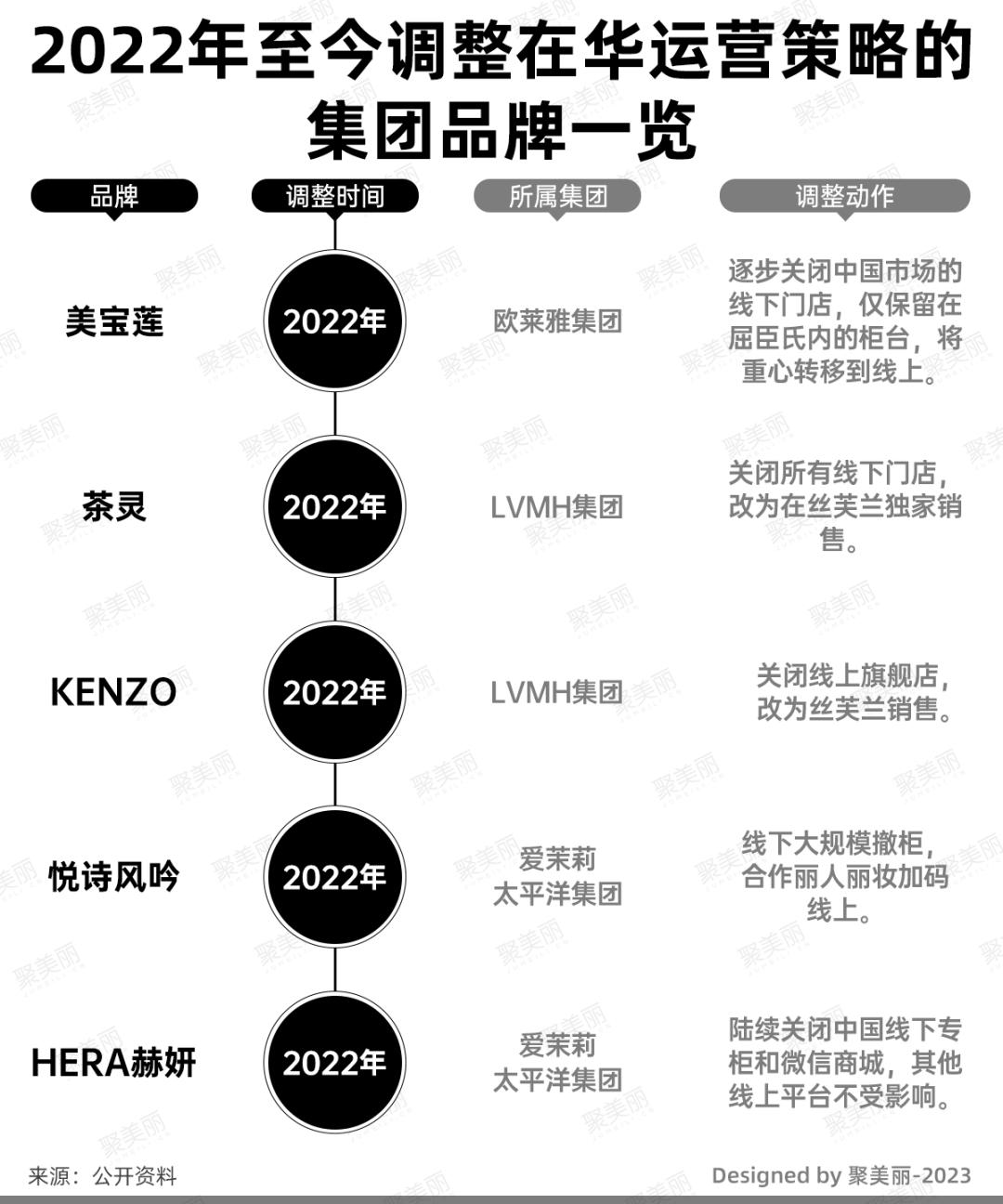 比如,LVMH集团在2022年就调整了旗下茶灵、KENZO在中国市场的布局,目前茶灵已关闭所有线下门店,改为丝芙兰独家销售,KENZO已关闭线上旗舰店改为丝芙兰销售。