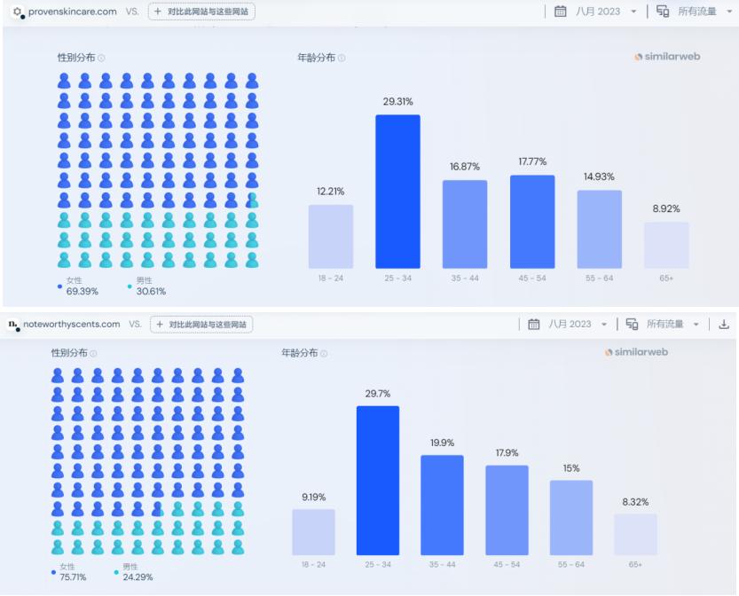 Proven(上)和 noteworthy(下)的网站浏览用户男女比例 | 来源:similarweb