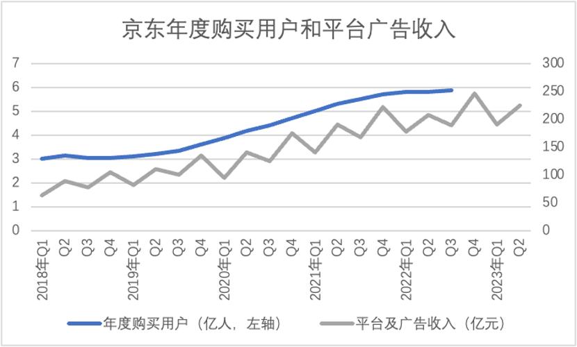 2023年Q2京东平台及广告收入同比增长10%,联系到上年同期的低基数这个数字确实不能算高,结合上图,我们大概可以猜测2023年京东用户增长的成绩应该也不如以往。