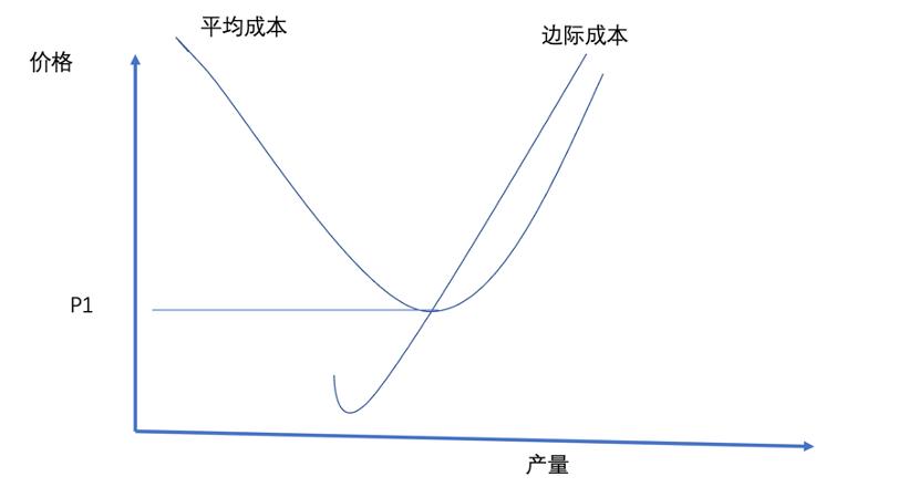 上图中P1为企业利润最大化的定价点,满足边际成本等于平均成本(前者为每每一单位新增生产的产品带来的总成本的增量),此时边际收益又等于边际成本。