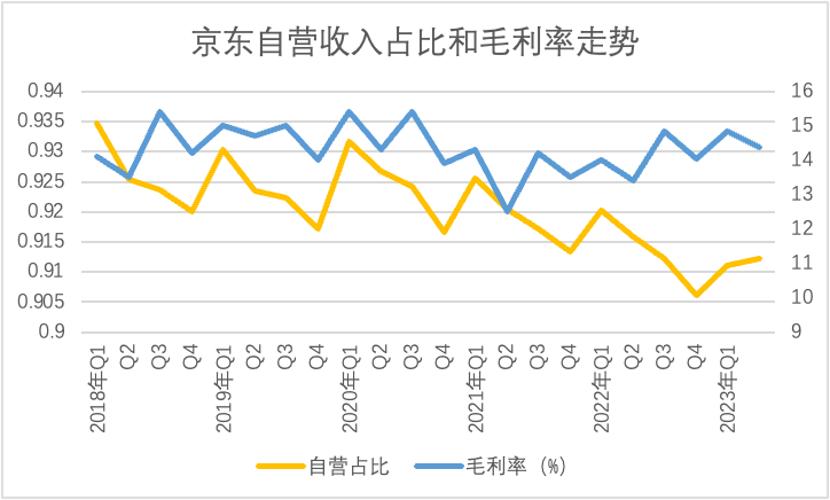 京东调整组织架构之后,市场曾普遍预期京东开放平台要迎来新的增长契机,对于损益表则体现为提高企业毛利率水平(开放平台的“卖流量”毛利率更高)。在上图中我们确实看到京东自营收入占比在2020年之后有了明显下降(开放平台占比增加),但另一方面京东的毛利率表现却非常“克制”,仅在2021年初有一次明显提振,到2022年中之后其改善势头明显触到了天花板。