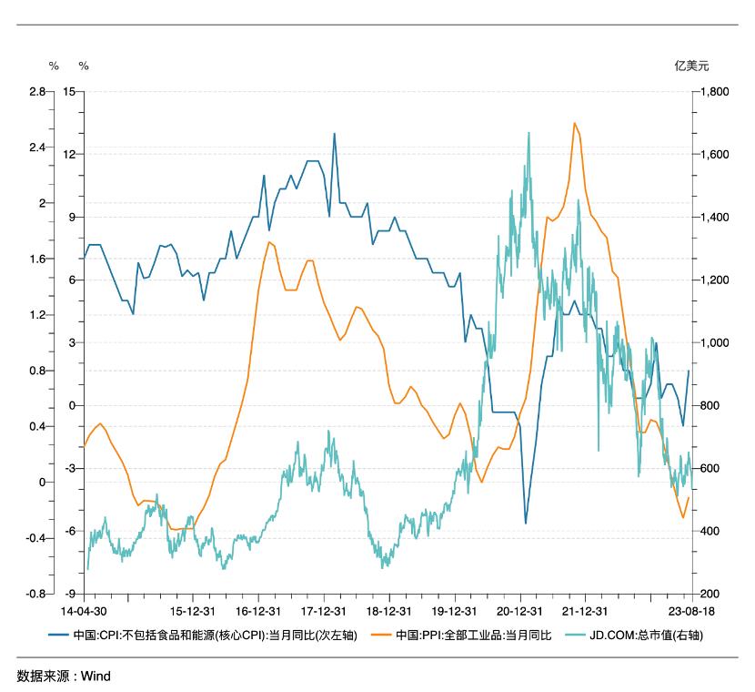当我们对比核心CPI,PPI以及京东市值走势时,会发现三条折线高度的一致性。