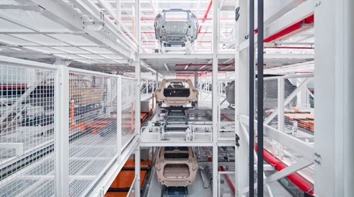“立体车库”是蔚来在两道生产工序之间建造的临时中转站,车辆或者说半成品车身在这里短暂停留,然后根据不同车间或工序的需求排列组合,分批进行统一作业。