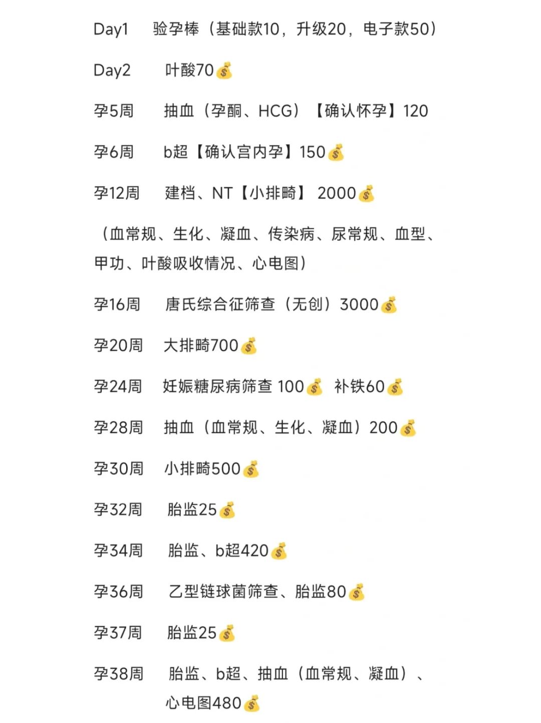 从确认怀孕到胎儿落地,大概40周期间的所有开销,一笔不落——
