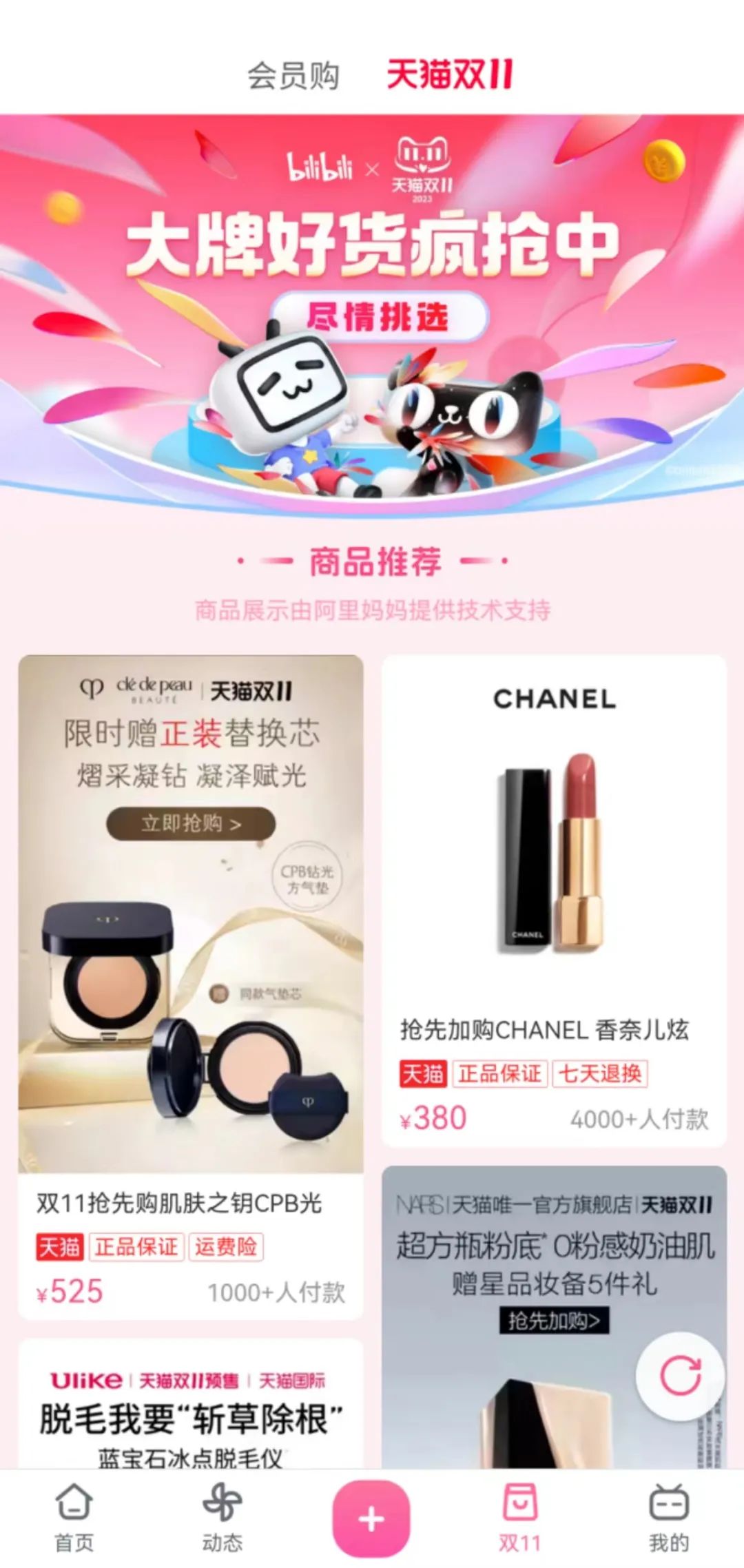 目前,B站已经将站内原“会员购”入口改名为“双11”入口,并新增“天猫双11”板块,直接展示天猫商品,支持点击跳转天猫页面购买。除此之外,B站也已经与阿里、京东、拼多多打通商品库,推进深度合作。
