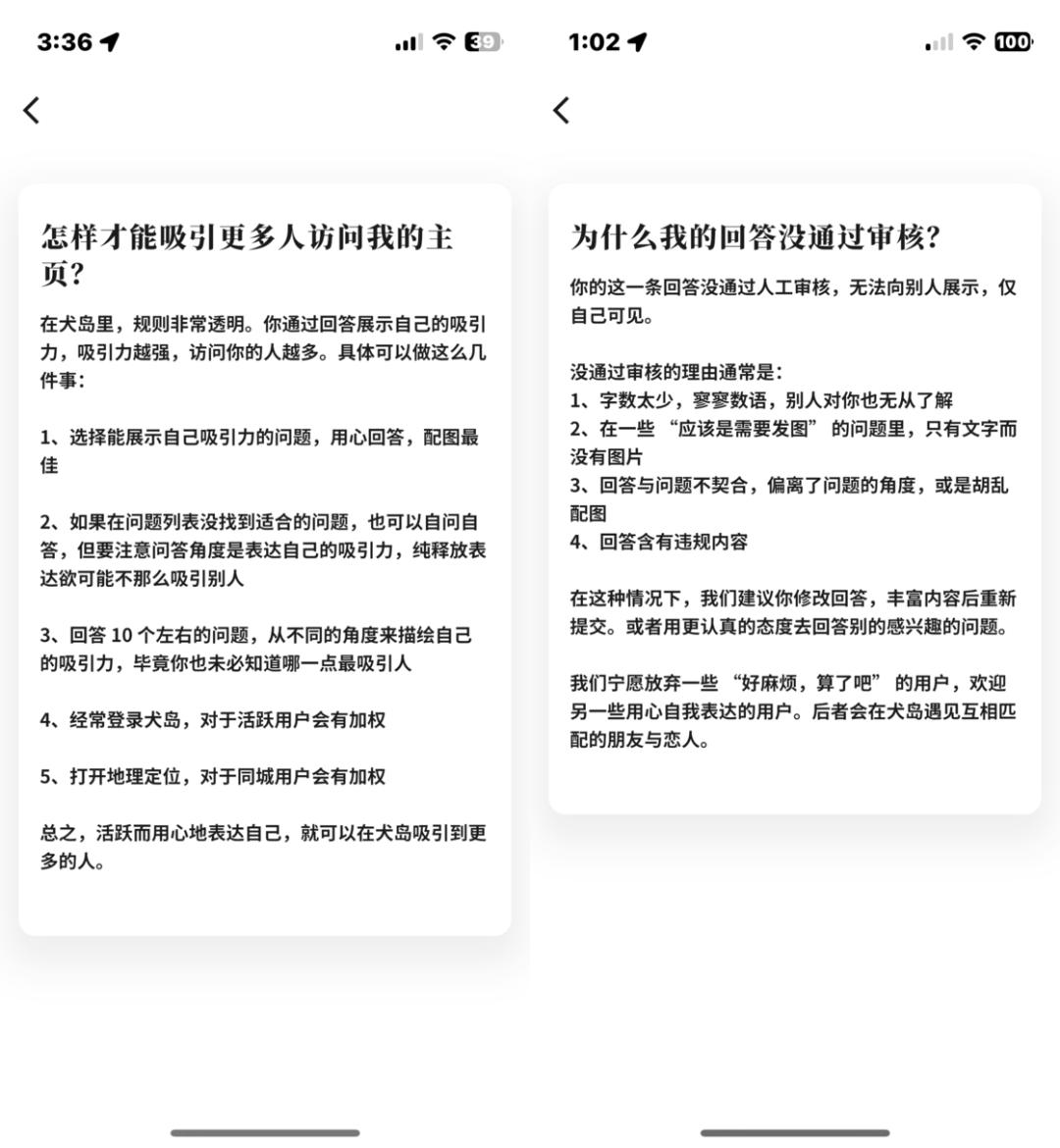 犬岛的代表性特色是以深度问题为引,引导用户展示自身吸引力,用户开始对话前只能通过对方的回答来了解对方,而这也是用户获取更多关注度的唯一途径。