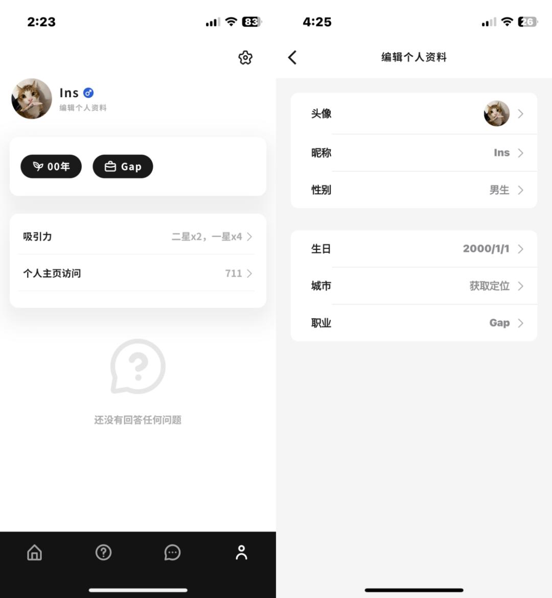 我们可查看匹配者的信息,有昵称、头像、性别、活跃状态,而年龄、地理位置(可选)与职业显示在第一条回答之后,这一定程度上引导用户关注匹配者的网络信息,而后才是现实信息。