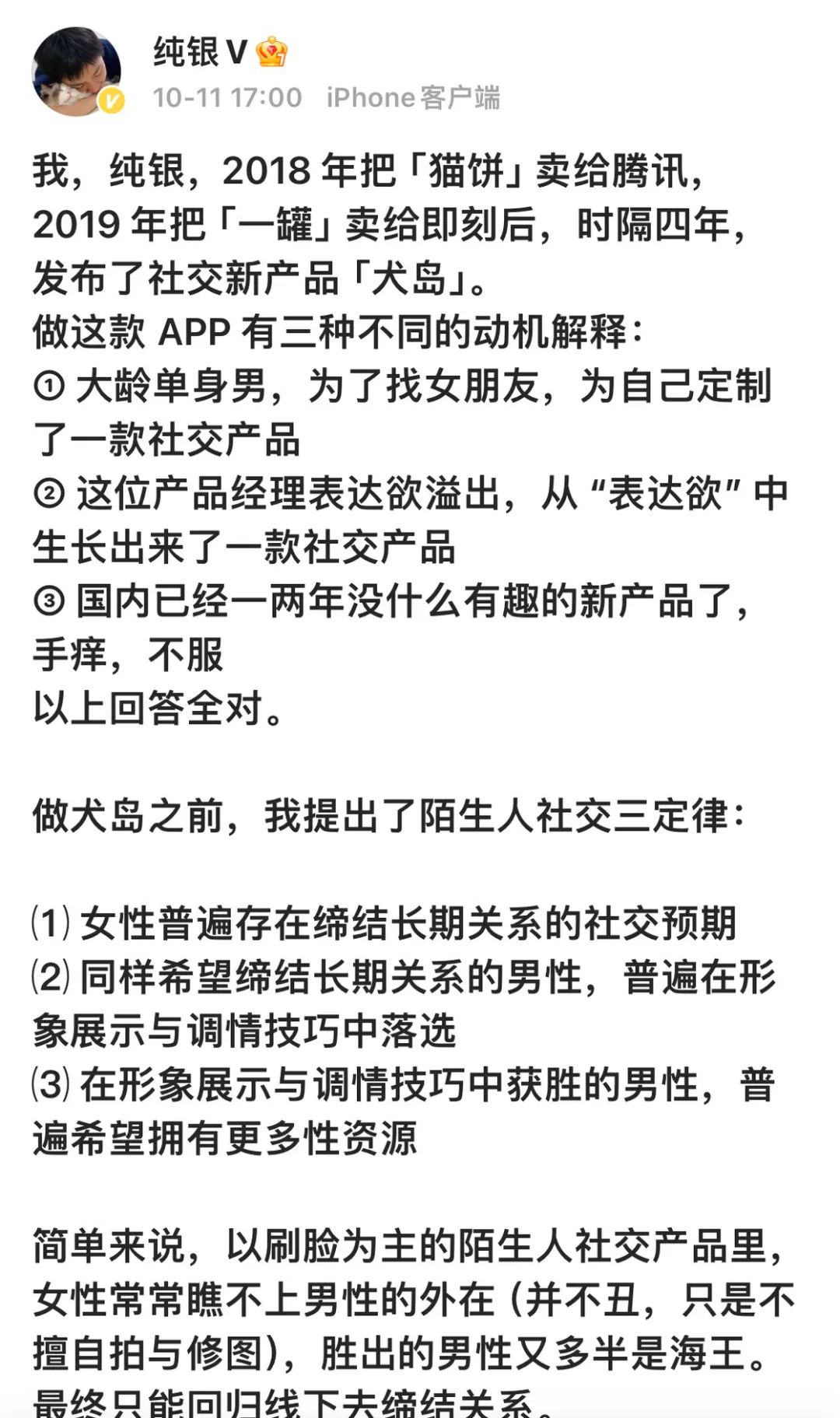犬岛的目标是什么?做史上内容最强的社交产品。展示用户「内在美」的自我表达,适合性吸引力驱动的异性社交以及 「想交一些朋友」 的泛社交、同性社交、大龄社交。