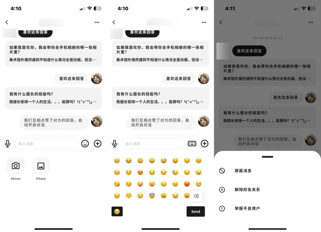 由于大多数用户分享的是展示自身魅力的内容,我乐于对此表示认可,所以我点赞的次数非常多,但由于开启对话的门槛非常之低,因此有大量对话开启,意味着我要面临海量消息的轰炸。这给我带来了第一次信息过载,大大降低了我跟其他用户开聊的欲望。下文会对此更详细地说明。