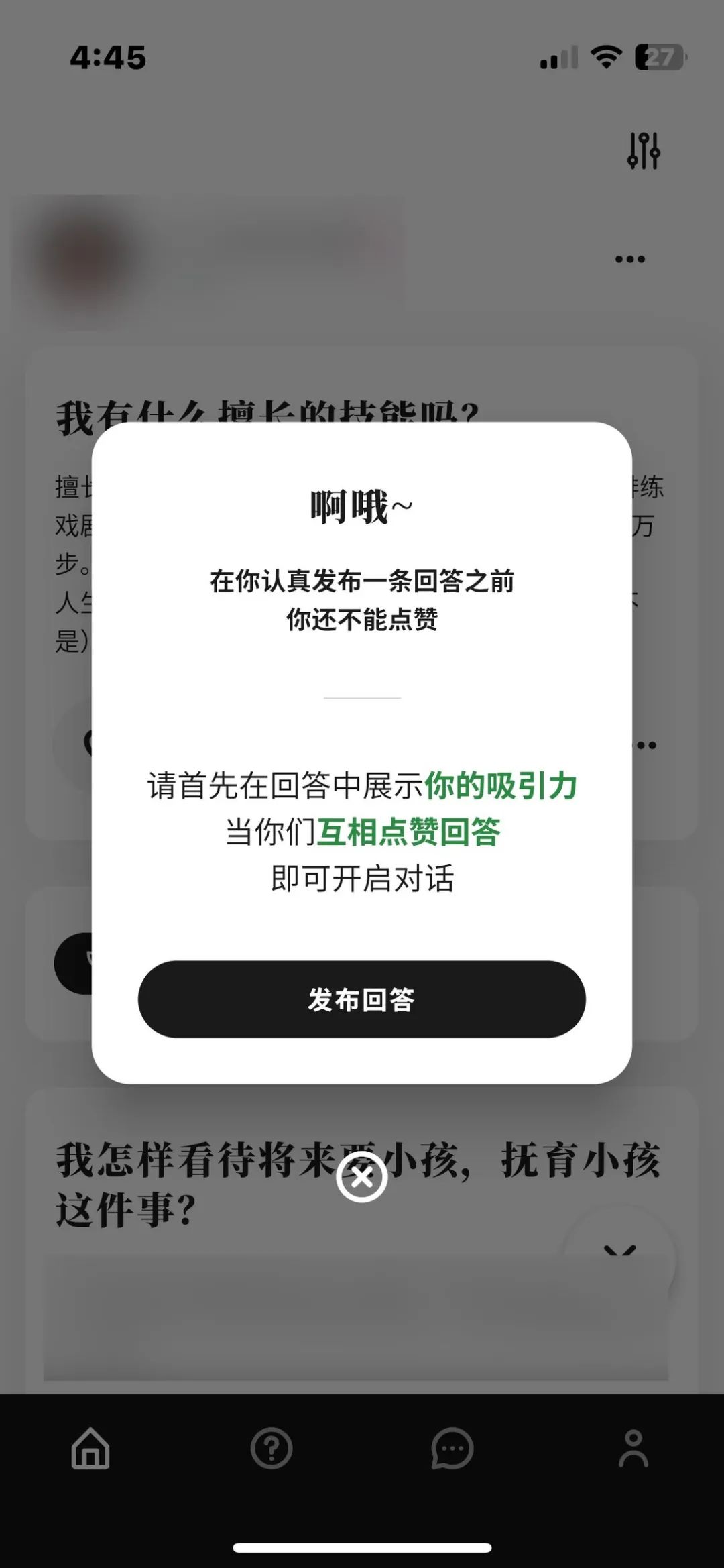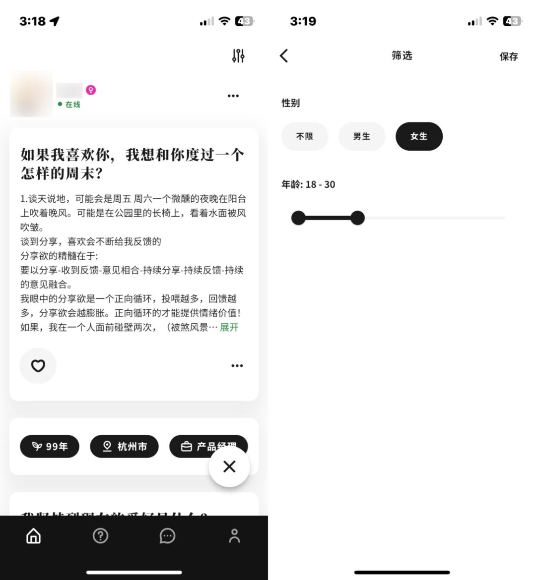 从自定义条件完成一次筛选进行匹配,到用户写出深度问题的回答,再到手动逐个点赞进行筛选,已经过两轮筛选,付出了不少的时间与精力,但真正可开启对话人数仍寥寥可数。