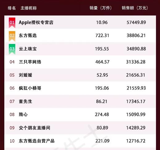 以9月抖音直播带货榜为例,三只羊网络公司旗下的三只羊网络、疯狂小杨哥均上榜,合计销售额超过5.2 亿元,分别位列榜单第4和第6位,东方甄选、交个朋友都排在其后。