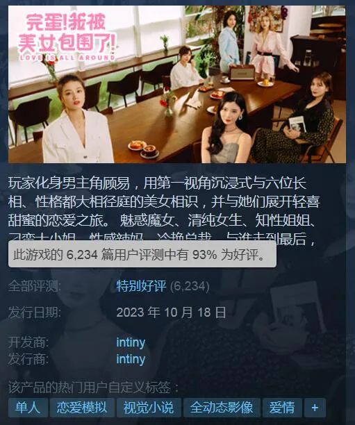 10月18日,Steam上一款名为《完蛋!我被美女包围了!》(下称《完蛋》)的真人互动视频游戏上线。游戏上线就冲上了国区游戏热销榜,上线一周便取得了超6000条评论,据SteamDB显示游戏同时在线人数突破4万。