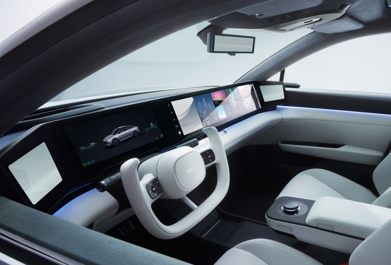 按照官方的说法,这款原型车在车内外搭载了45 个摄像头和传感器,内部配备了超长的一体式中控屏,内置了索尼的影视、音乐、游戏等娱乐功能。