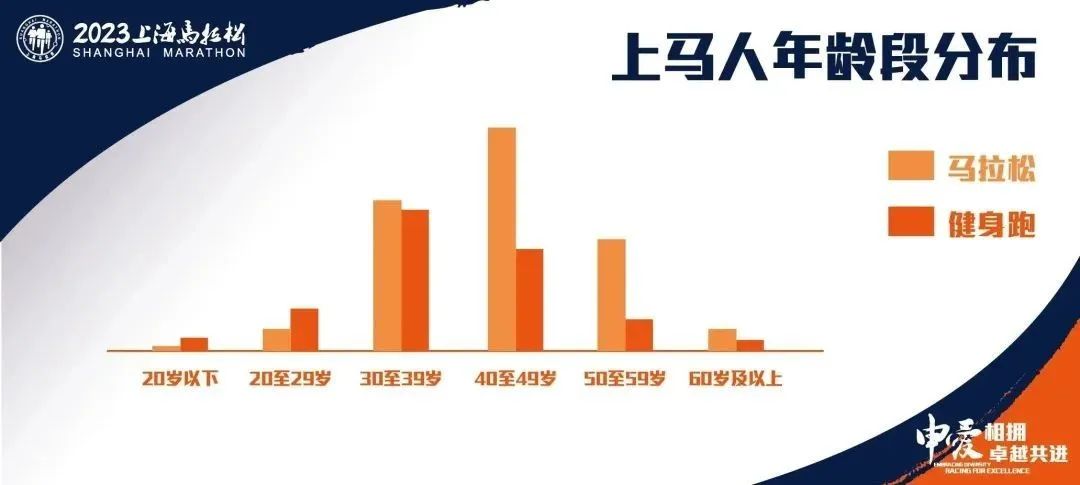 随着跑步越来越成为大家日常生活中的重要一部分,不同年龄段的人口也加入到了上马的行列当中。全马项目中,40-49岁的跑者成为本届上马主力,报名今年全马项目60岁以上的人数将近600人。此外,今年的上马也迎来了4330位第一次上岸的跑者。