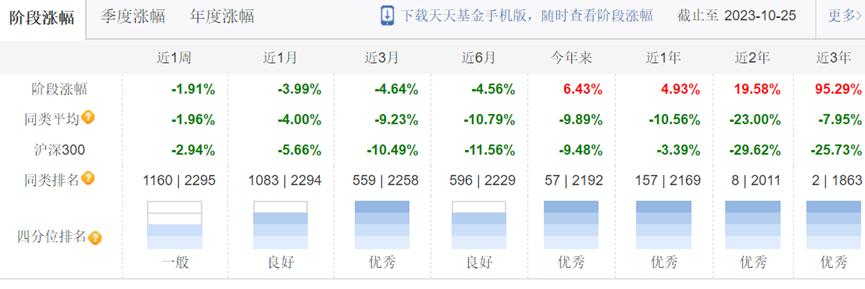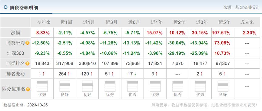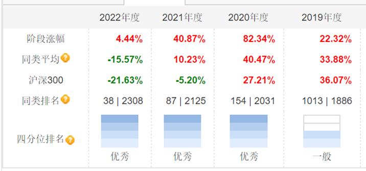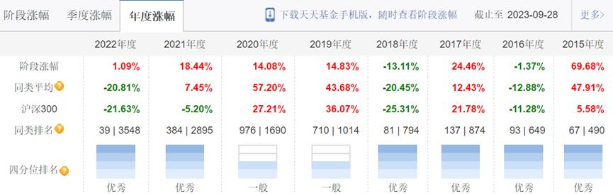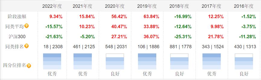 规模迅速增长,离不开能涨抗跌的好业绩。下面是他单独管理超过7年的产品华商优势行业的业绩,可以看到每一年都保持在行业中上游水平。即使在市场动荡的今年,依然获得近3%的正收益。