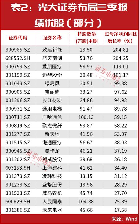 此外,光大证券的现身布局的多家公司也均为绩优股。数据显示,截至目前,光大证券共现身68家公司前十大流通股股东名单。其中,新进现身公司数量为64家。进一步来看,其中,多数公司三季报业绩实现增长,如致远新能、航天南湖、爱朋医疗、迈赫股份等(见表2)。