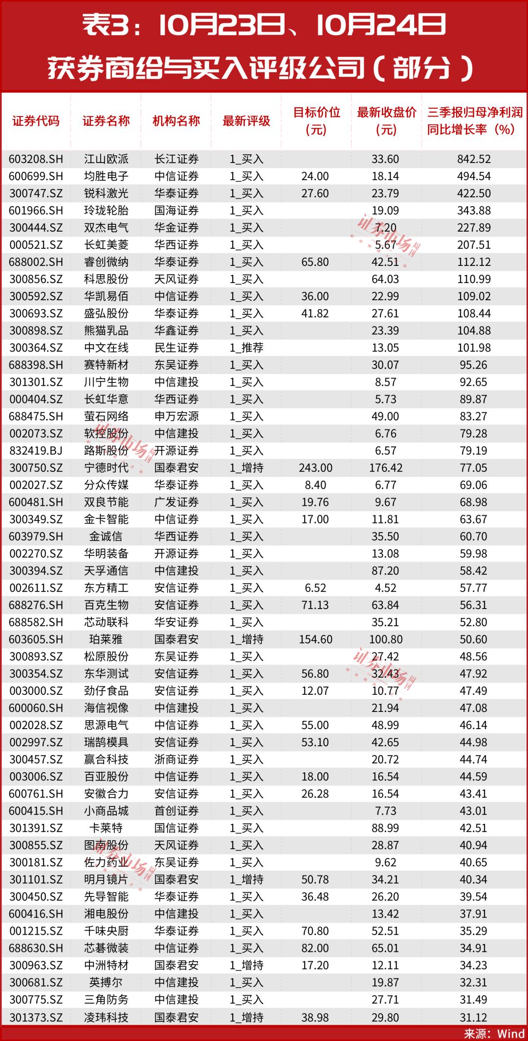 据不完全统计显示,10月以来,有670余家公司(剔除重复)获得券商给出买入评级,10月20日以来即有293家,进一步来看,其中,不少公司均为刚刚发布三季报不久的绩优股,如江山欧派、均胜电子、锐科激光、玲珑轮胎、双杰电气等,上述公司2023三季报净利润均实现翻倍增长;另有包括赛特新材、川宁生物、彩讯股份、长虹华意、软控股份等在内的多家公司也实现了超过50%的业绩增幅(见表3)。