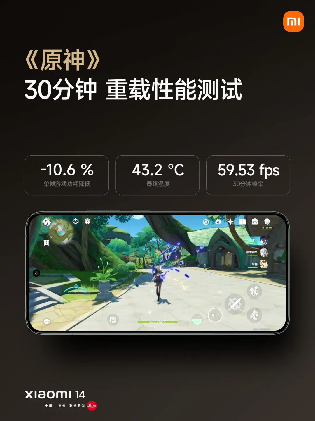 在《原神》测试环节中,小米14能够做到在30分钟内平均帧率在60帧上下且机身温度保持在43℃左右。又是一台性能拉满的游戏旗舰手机。