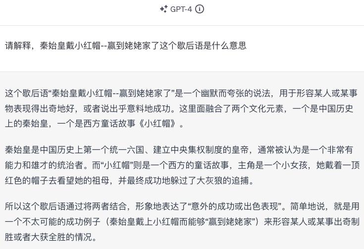 但就算是「先进如GPT-4」的AI模型却还是无法理解这个歇后语,即使他知道「秦始皇叫嬴政」,以及「小红帽」的故事。