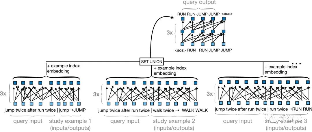另一方面,使用更抽象的功能词,比如「blicket、kiki、feg」,为之前的原始词术语的应用和组合制定了规则,从而推断出「skip twice、walk backwards」等序列。