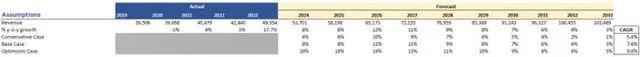 因此,看起来该公司过去的销售业绩并不能很好地预示未来,特别是考虑到云服务的前景如何,再加上该公司 26 财年的销售预测约为 650亿美元,我认为假设公司的表现将比过去好得多。对于估值模型,我选择了三种合理且保守的情景,以给我额外的安全边际。以下是我对基本情况、乐观情况和保守情况的收入预测。