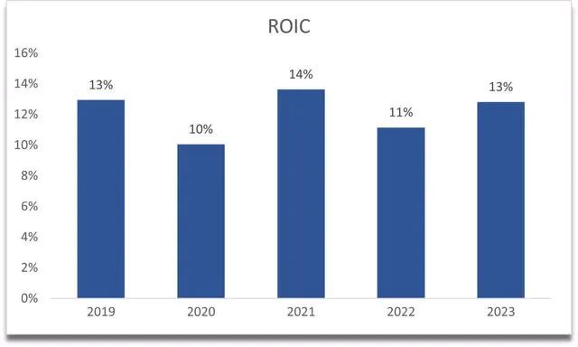 从公司的投资资本回报率来看,我们可以看到截至 2023 财年,公司取得了一些进步。该公司似乎正在重新获得竞争优势,考虑到该公司在该领域的竞争,这并不容易。同样令人高兴的是,该公司正在创造价值,因为其加权平均资本成本 (WACC) 约为 8%,远低于 ROIC。