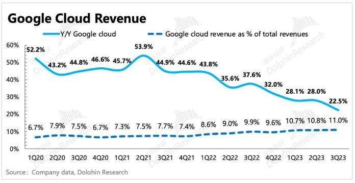 从增长趋势看,谷歌云与Azure也有差距进一步拉大的风险,Azure开始加速增长,同比增速较上季度提高了2个百分点。谷歌云则开始减速,同比增速较上季度下降7.5个百分点。