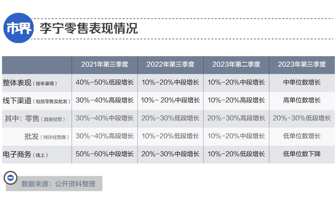 2023年第三季度,李宁的销售额从二季度的10%-20%的中段增长,下降成了中单位数增长。