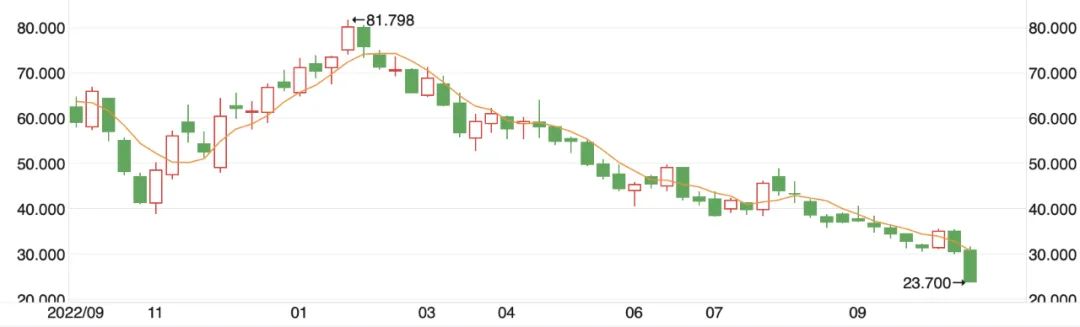 今年以来,对于李宁来说,股价下跌似乎不是什么新鲜事了。从今年1月底高点的收盘价79.33港元/股算起,已跌去69%,蒸发1500亿港元市值。