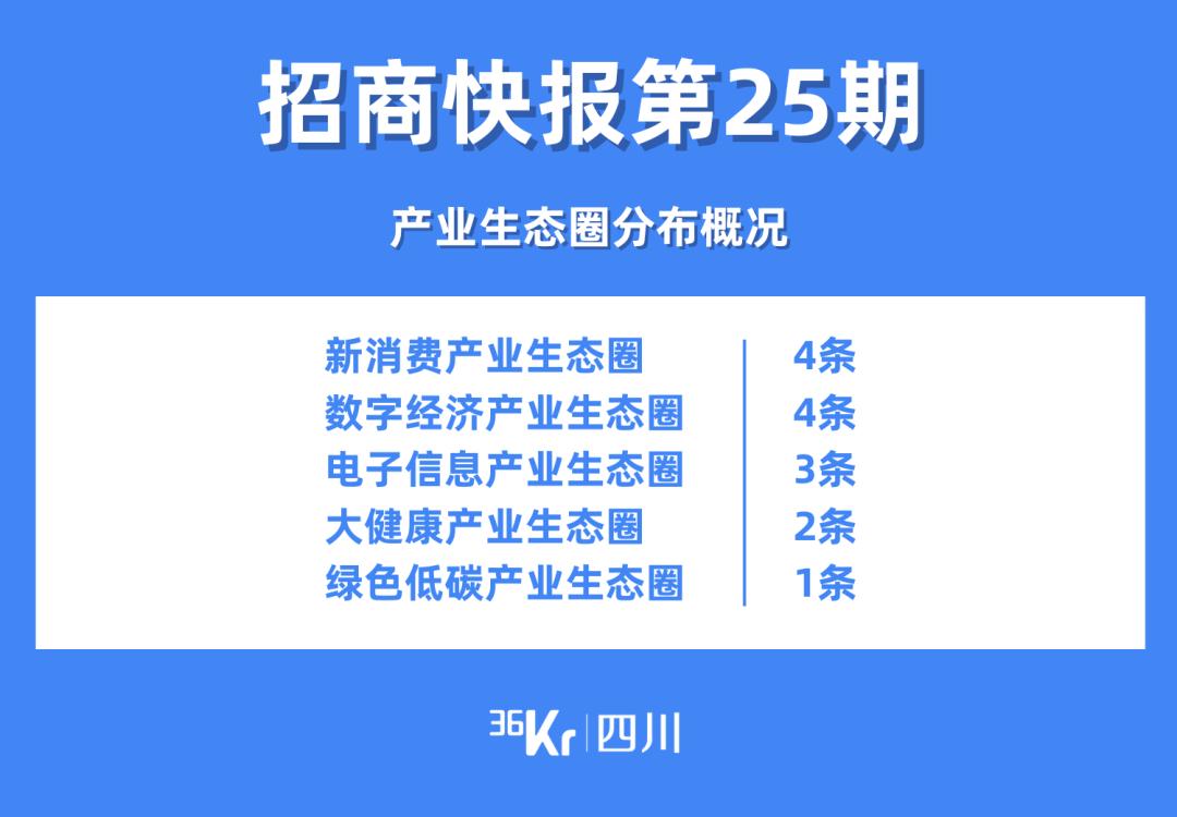 通过对产业生态圈内容的汇总,过去一周的招商动态主要集中在新消费产业生态圈(4条)、数字经济产业生态圈(4条)、电子信息生态圈(3条)、大健康产业生态圈(2条)、绿色低碳产业生态圈(1条)。
