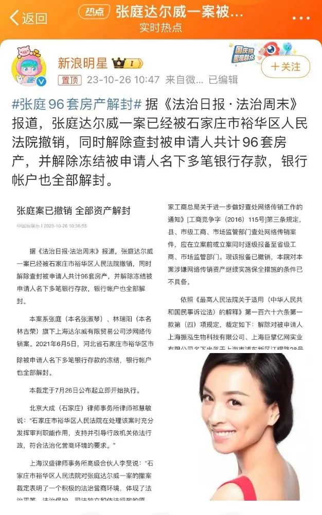 据《法治日报·法治周末》报道,张庭达尔威一案已经被石家庄市裕华区人民法院撤销,同时解除查封被申请人共计96套房产,并解除冻结被申请人名下多笔银行存款,银行账户也全部解封。